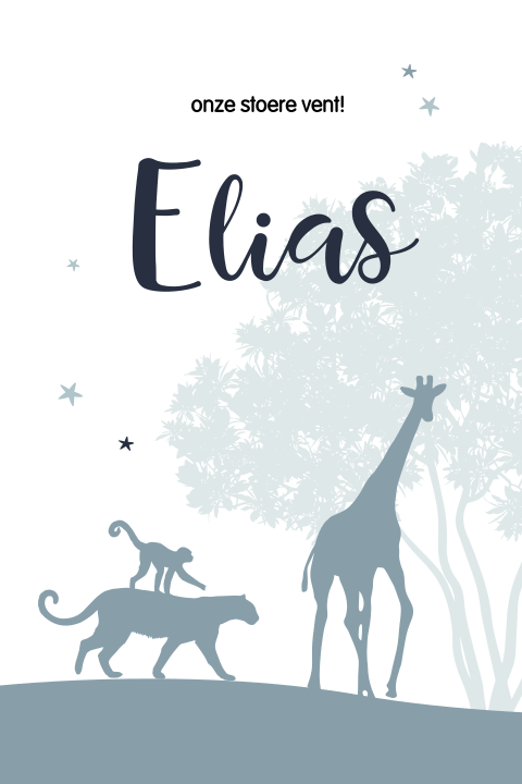 Stoere geboortekaart met jungle dieren en sterretjes